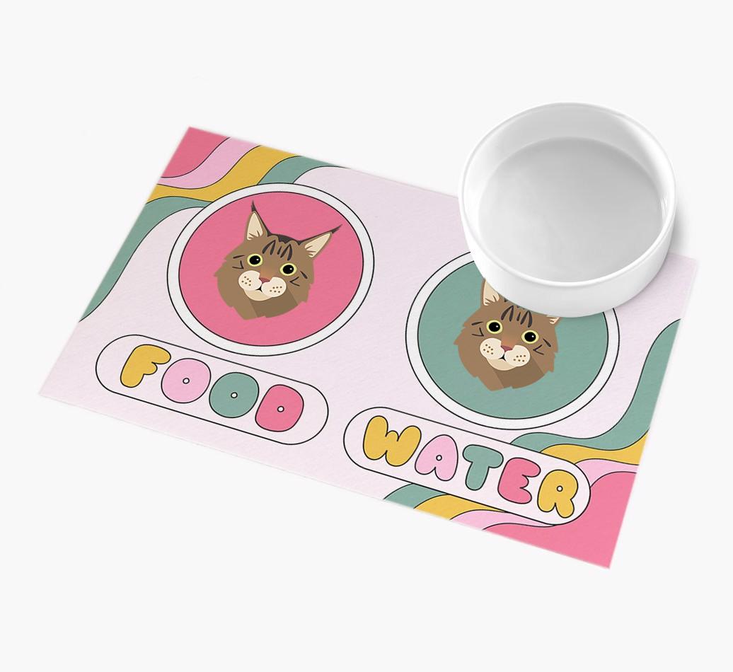 With a swirl of pastel colours and the addition of cute Maine Coon icons, this feeding mat is a stylish place to sit Maine Coon’s food and water bowls!