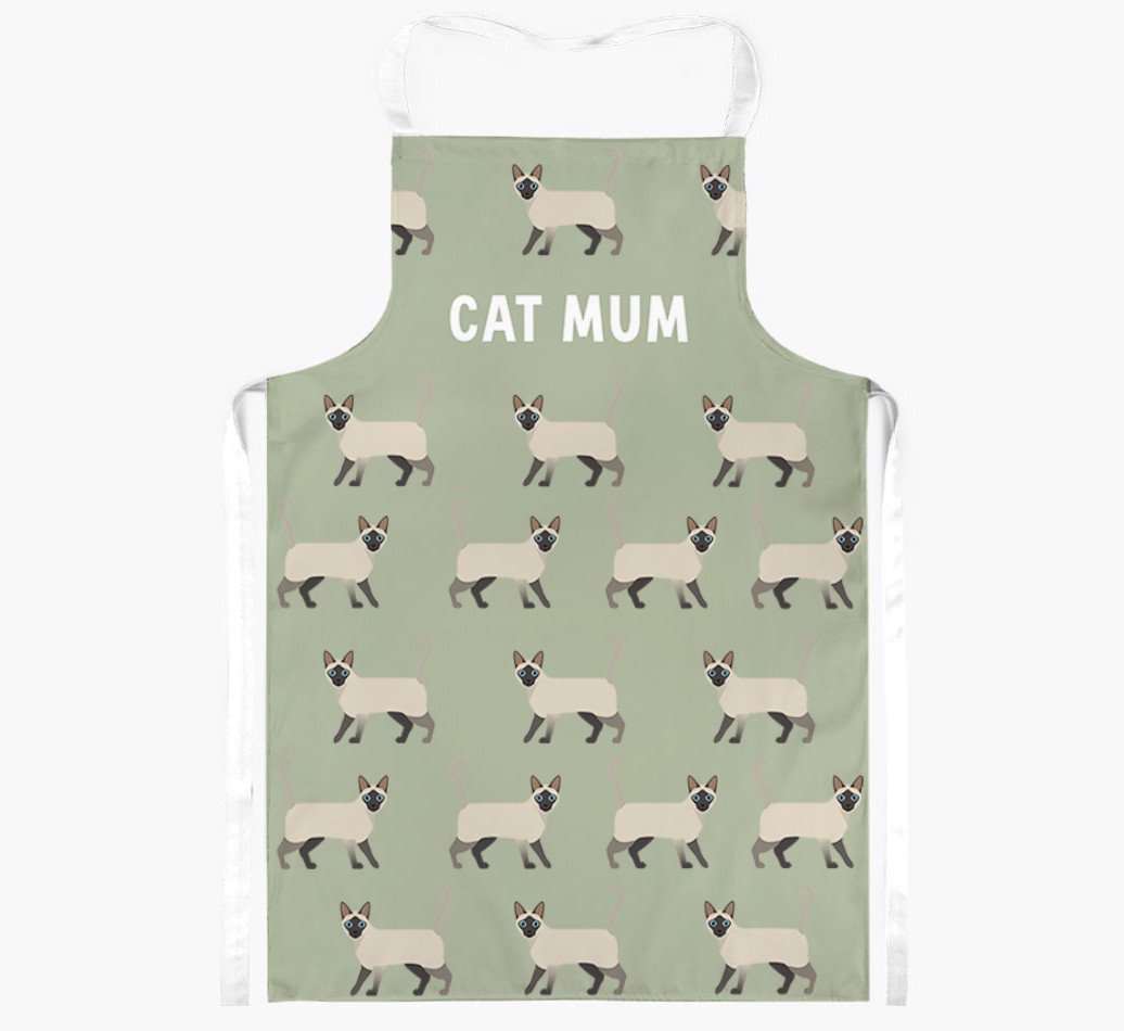 Available in five stylish colours, this apron is made extra special as it's personalised with a pattern of Siamese icons. Pawfect!