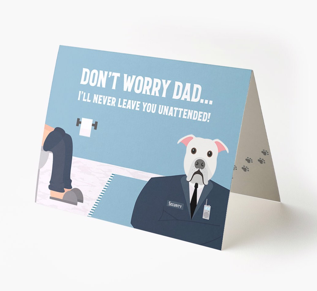 Pawfect for father's day and for American Bulldog dads, this card is the ultimate way to let your dad know that his personal security guard (American Bulldog) will never leave him unattended!