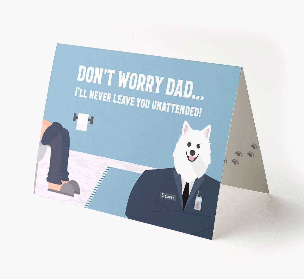 Pawfect for father's day and for American Eskimo Dog dads, this card is the ultimate way to let your dad know that his personal security guard (American Eskimo Dog) will never leave him unattended!