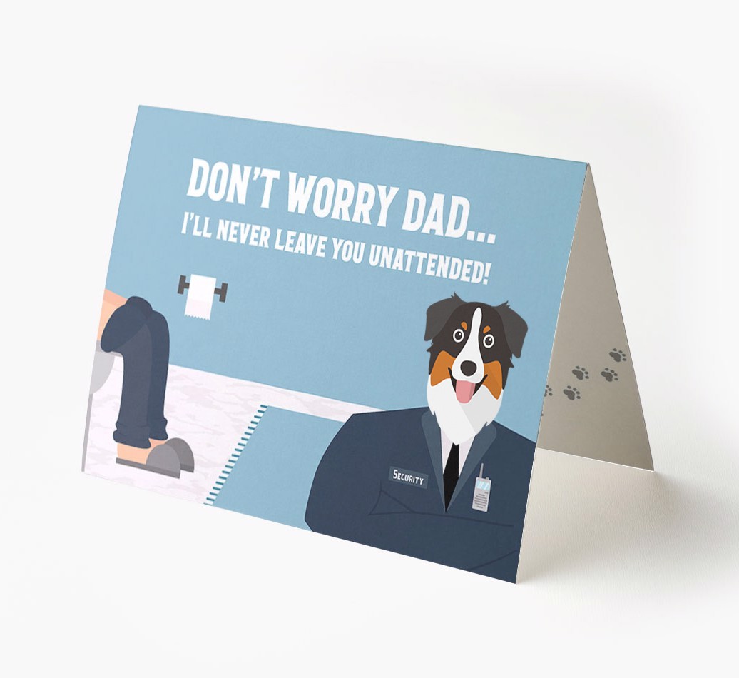 Pawfect for father's day and for Australian Shepherd dads, this card is the ultimate way to let your dad know that his personal security guard (Australian Shepherd) will never leave him unattended!