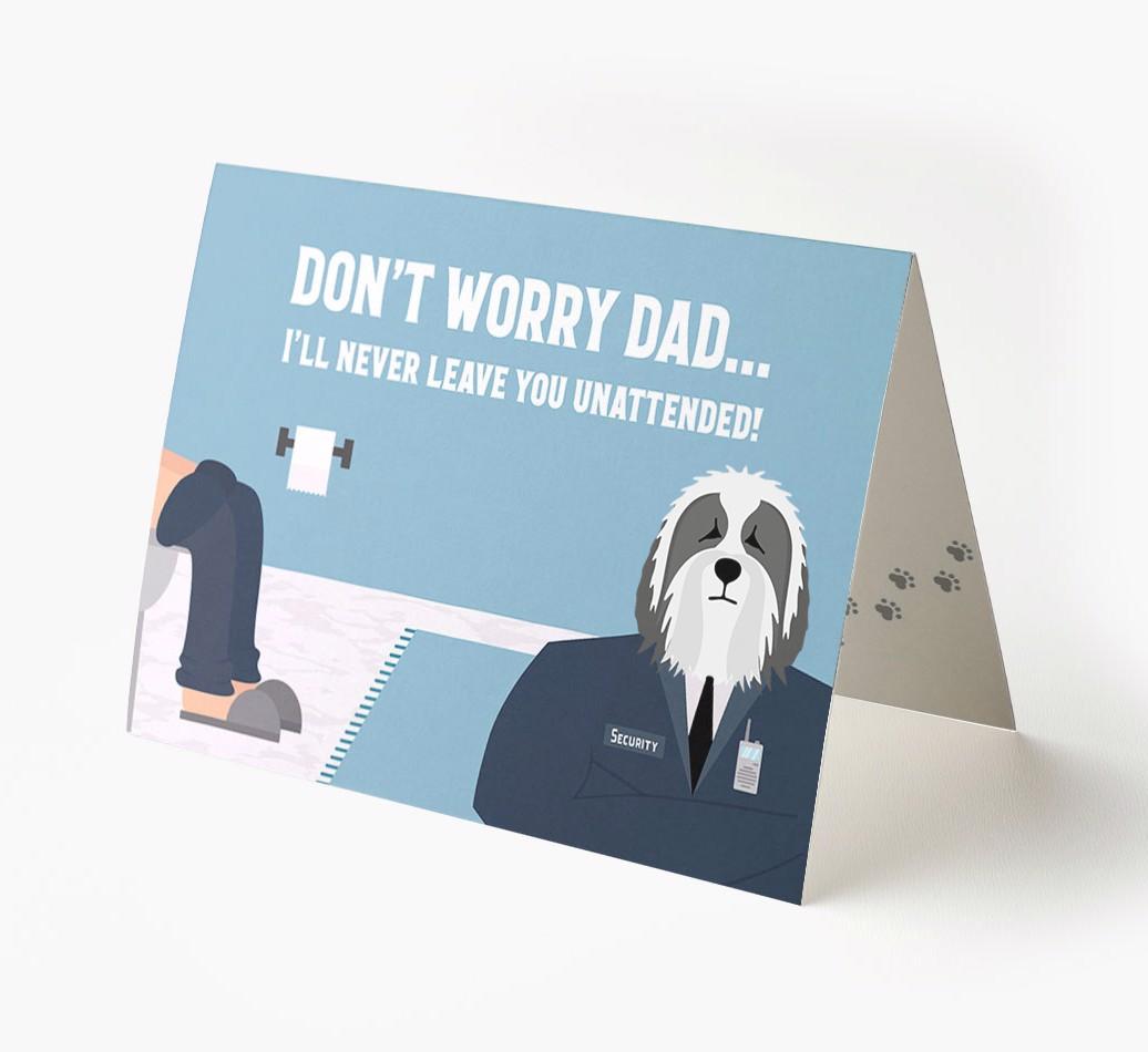 Pawfect for father's day and for Bearded Collie dads, this card is the ultimate way to let your dad know that his personal security guard (Bearded Collie) will never leave him unattended!