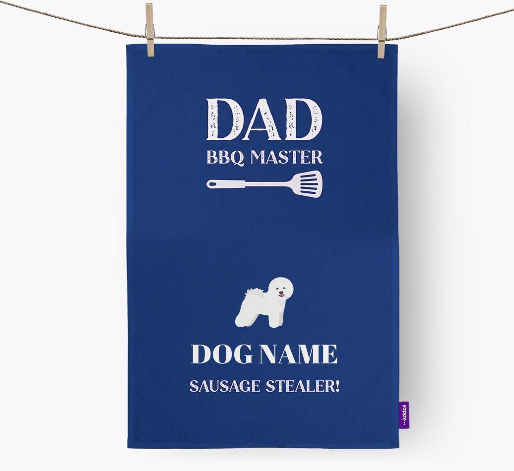 This personalised tea towel is the best way to hand over the title of 'BBQ Master' to Bichon Frise's dad.