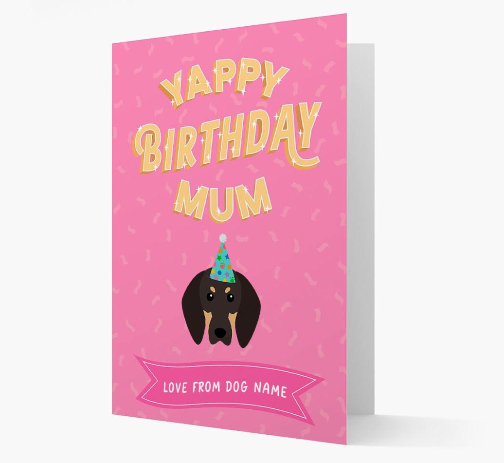 This customisable Coonhound card is a woofly way for Black and Tan Coonhound to wish their mum the yappiest of birthdays!