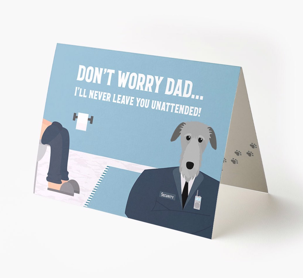 Pawfect for father's day and for Deerhound dads, this card is the ultimate way to let your dad know that his personal security guard (Deerhound) will never leave him unattended!
