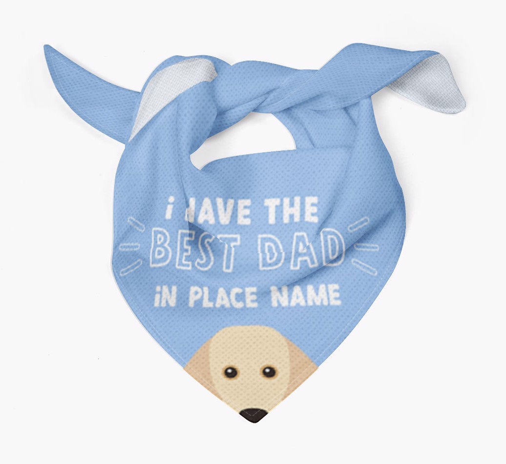 Cute and comfortable, this bandana is personalised with Golden Dox's icon and their place name to make it both a great gift for Golden Dox and their wonderful dad.