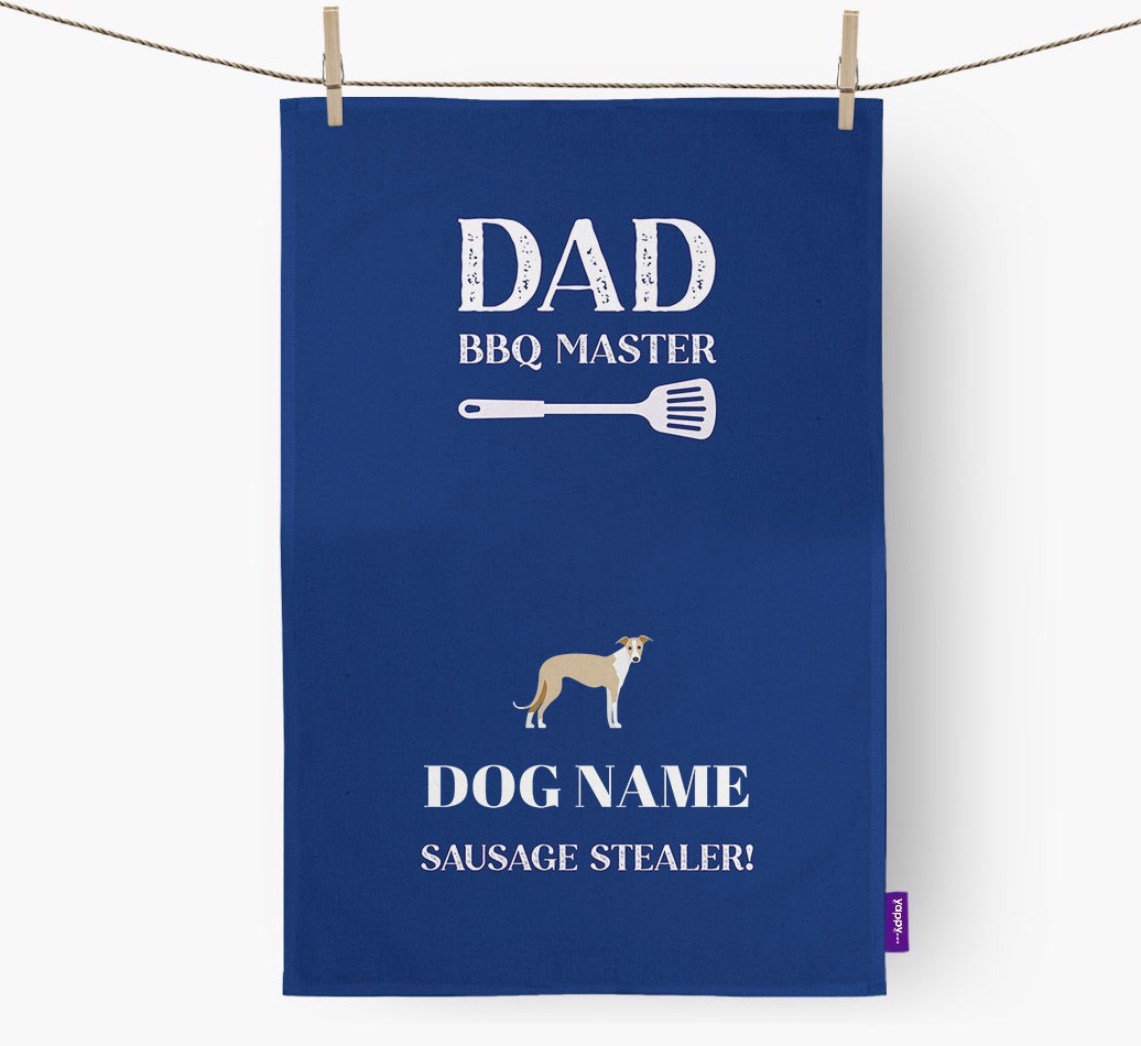 This personalised tea towel is the best way to hand over the title of 'BBQ Master' to Greyhound's dad.