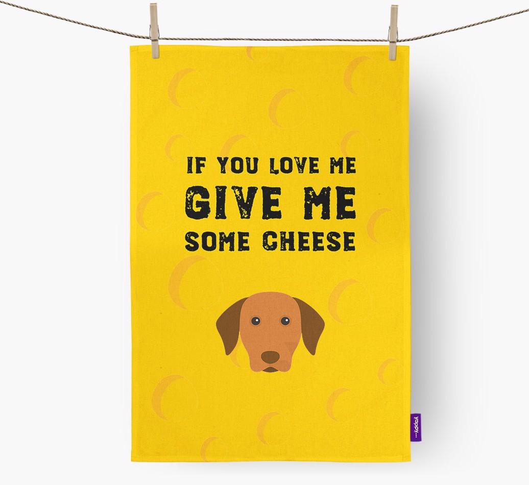 This exclusive Yappy tea towel features a pawsome Hungarian Vizsla icon upon a cheese themed background and Hungarian Vizsla's furvourite phrase ‘If you love me, give me some cheese’.