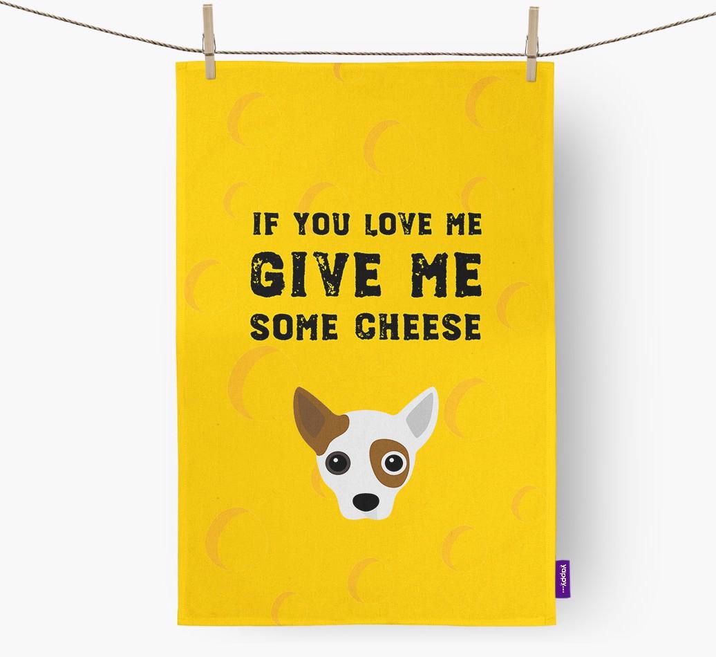 This exclusive Yappy tea towel features a pawsome Jackahuahua icon upon a cheese themed background and Jackahuahua's furvourite phrase ‘If you love me, give me some cheese’.