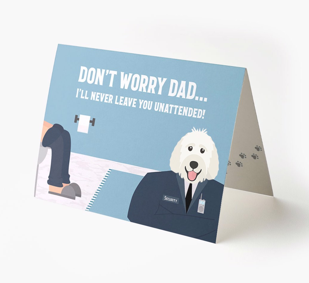 Pawfect for father's day and for Labradoodle dads, this card is the ultimate way to let your dad know that his personal security guard (Labradoodle) will never leave him unattended!