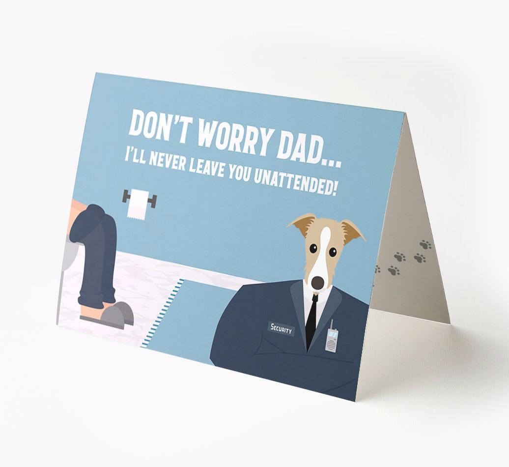 Pawfect for father's day and for Lurcher dads, this card is the ultimate way to let your dad know that his personal security guard (Lurcher) will never leave him unattended!