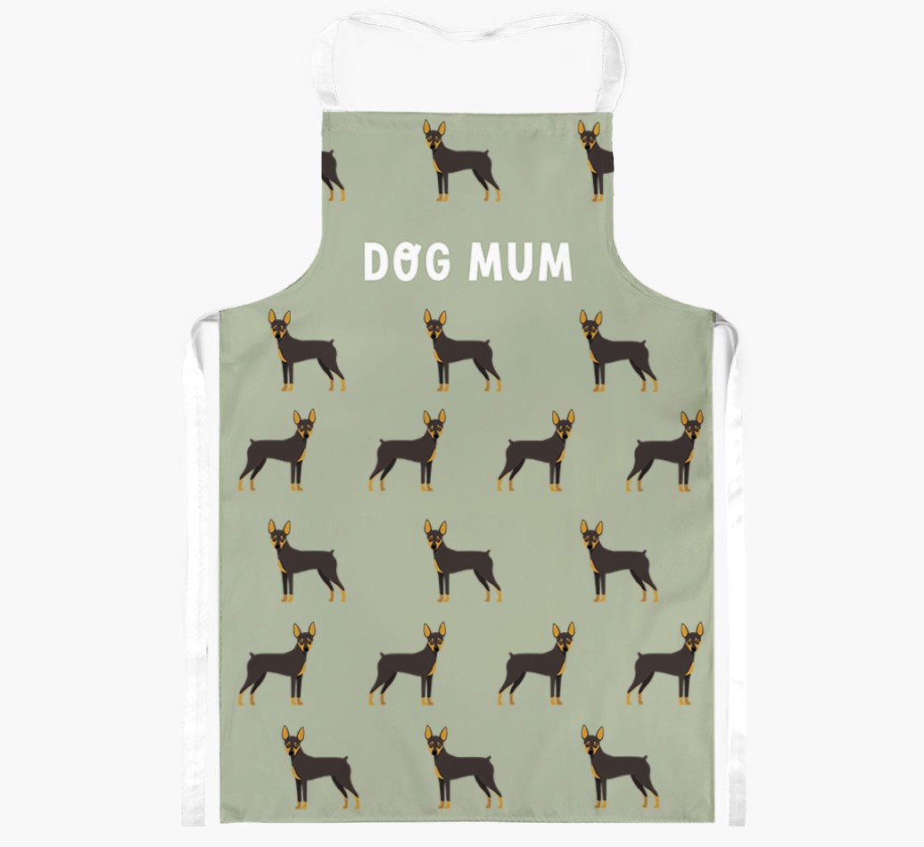 Available in five stylish colours, this apron is made extra special as it's personalised with a pattern of Min Pin icons. Pawfect!