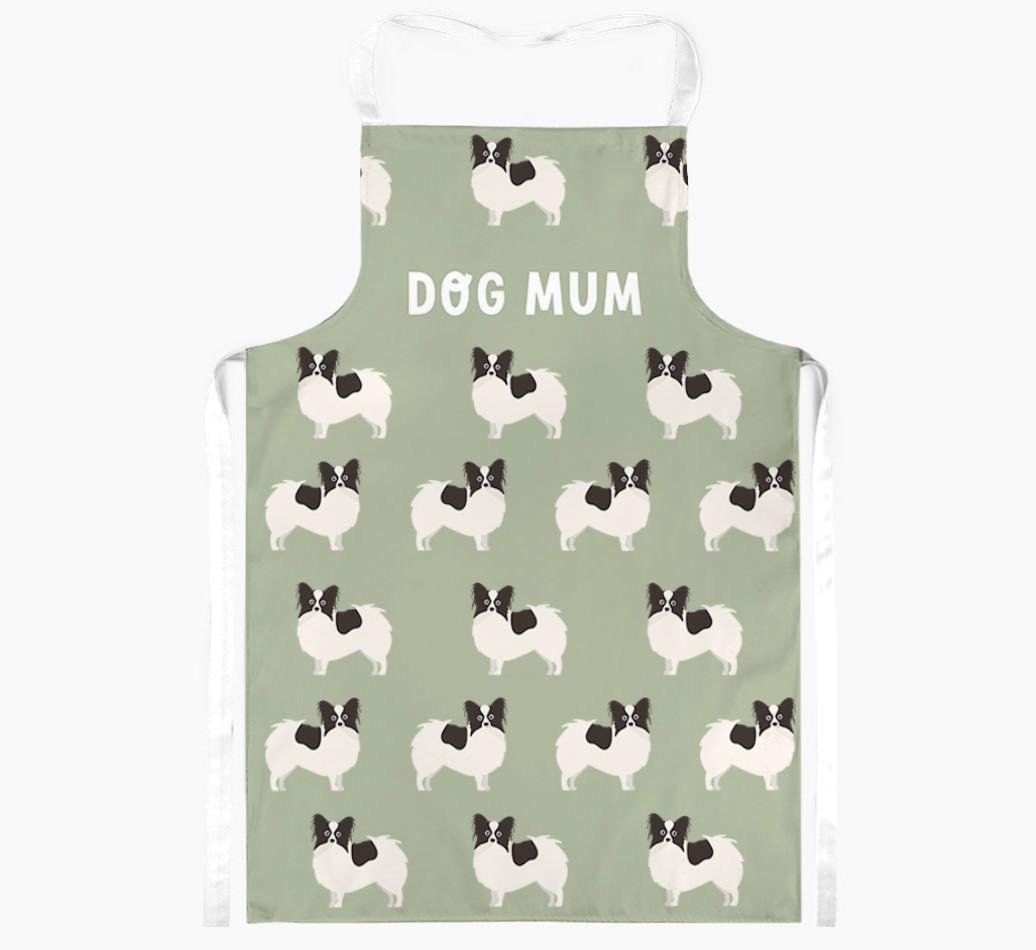 Available in five stylish colours, this apron is made extra special as it's personalised with a pattern of Papillon icons. Pawfect!