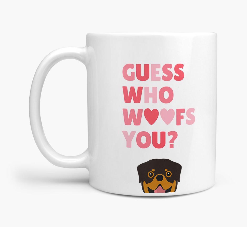 Personalised with Rottweiler's cute face, this adorable mug is perfect for showing off the one who "woofs" you - how sweet!