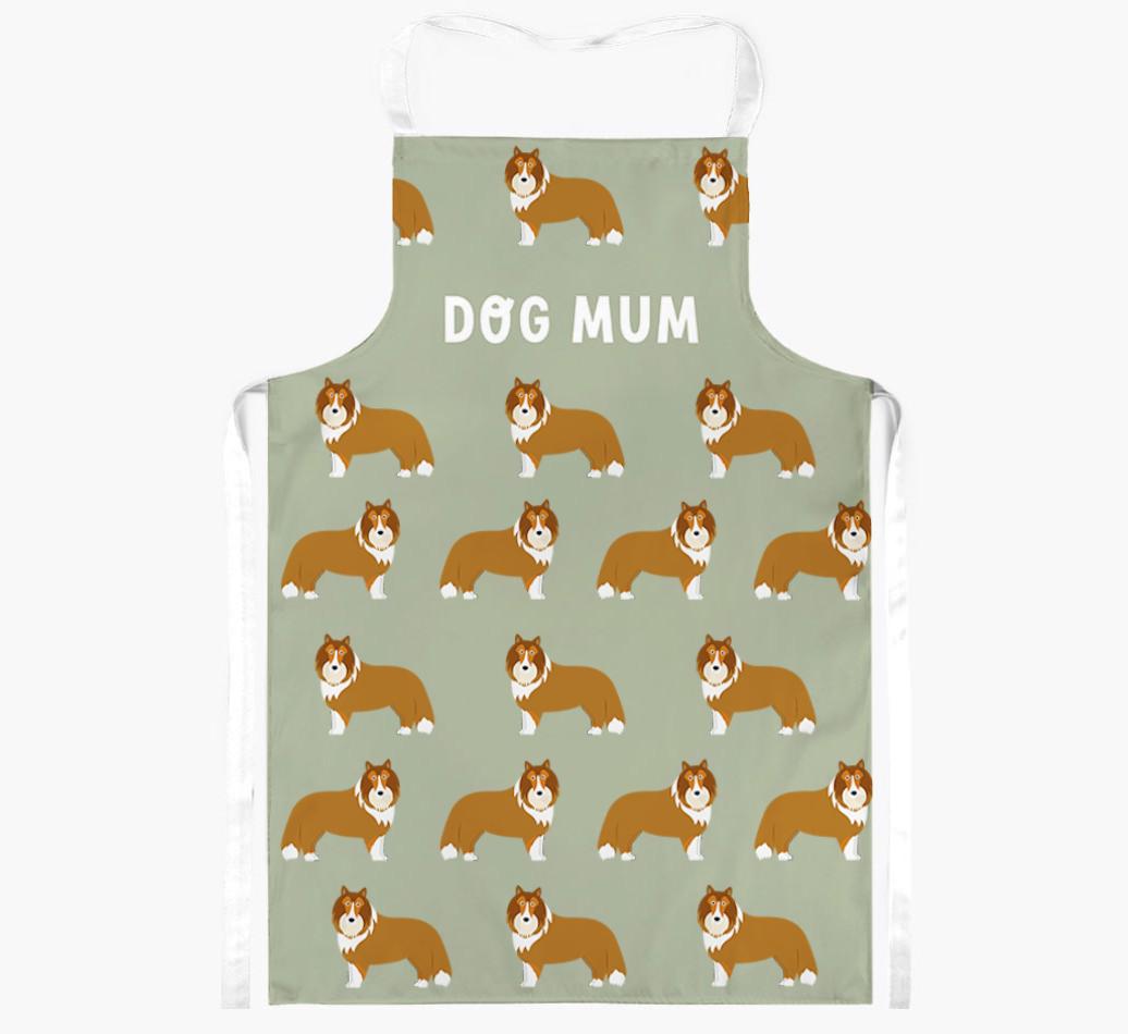 Available in five stylish colours, this apron is made extra special as it's personalised with a pattern of Collie icons. Pawfect!