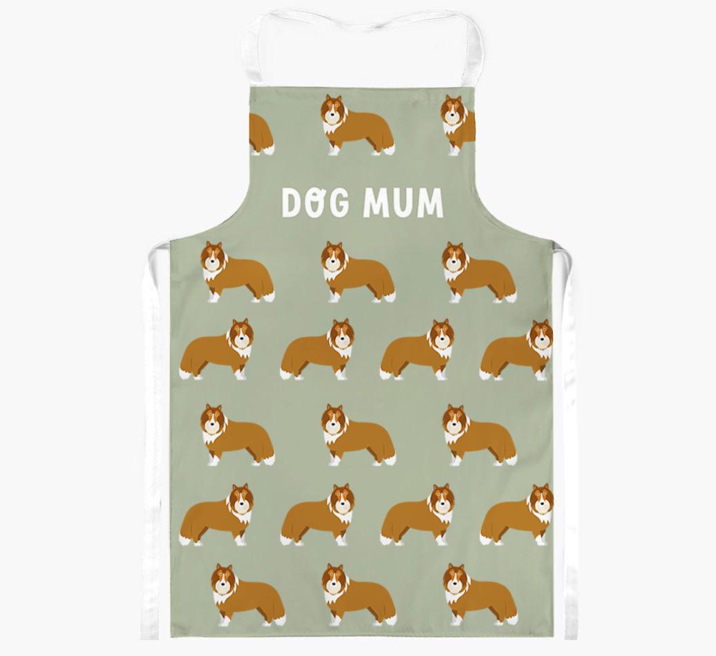Available in five stylish colours, this apron is made extra special as it's personalised with a pattern of Sheltie icons. Pawfect!