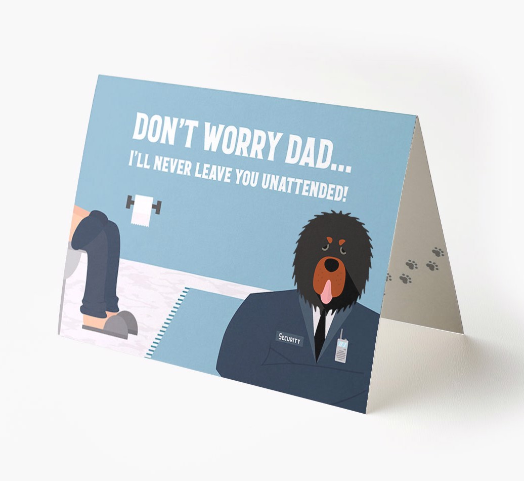 Pawfect for father's day and for Tibetan Mastiff dads, this card is the ultimate way to let your dad know that his personal security guard (Tibetan Mastiff) will never leave him unattended!