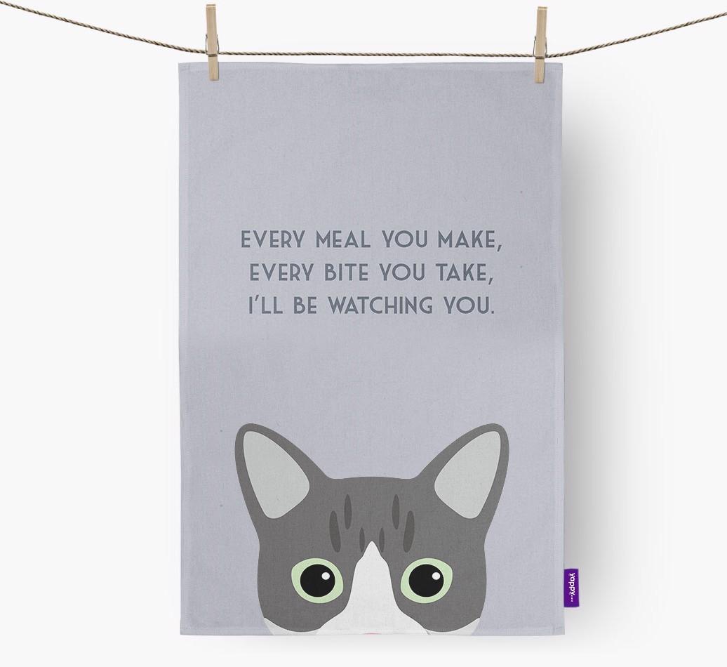 Printed with the words: ‘Every meal you make, every bite you take, I’ll be watching you’, this dish towel is purrfect for letting your cheeky Aegean know you’re onto them!