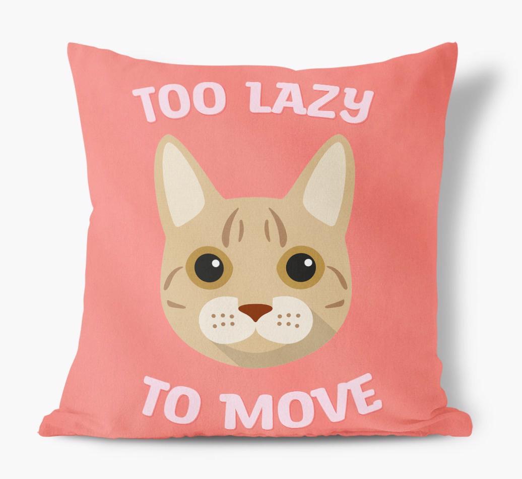 Featuring your Cat's icon, the words 'Too Lazy To Move' and available in five bold colors, this pillow will add a sprinkle of Australian Mist's pawsonality to any living area.