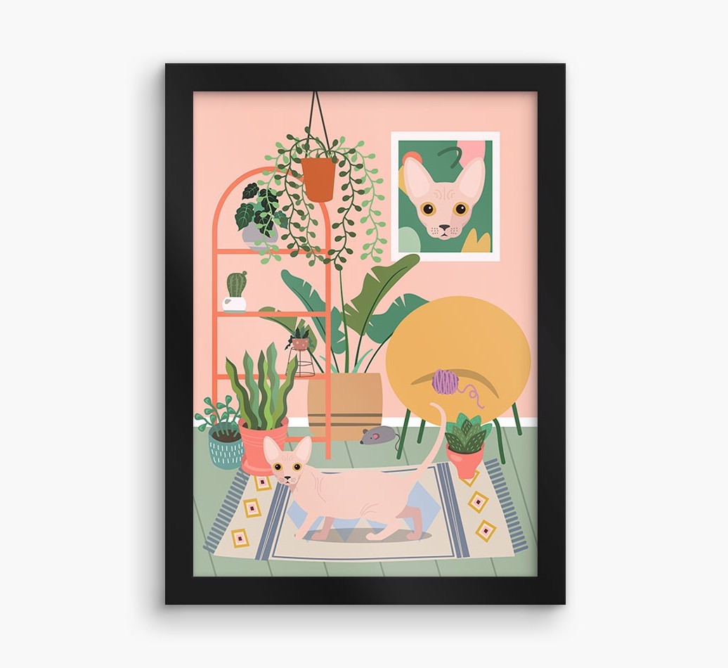 This contemporary piece of wall art pairs a chic living space with lovely pastel tones and a jungle of houseplants. Complete with the one that makes your house a home - Bambino! - this print is a wonderful way to display your love for your kitty.