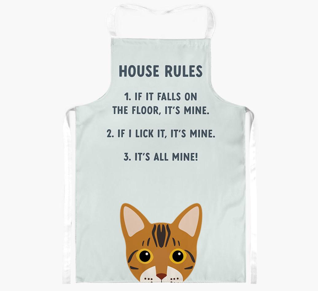 A fun way to show off your greedy kitty, this stylish apron is personalized with your feline friend's icon and features their rules when it comes to food.