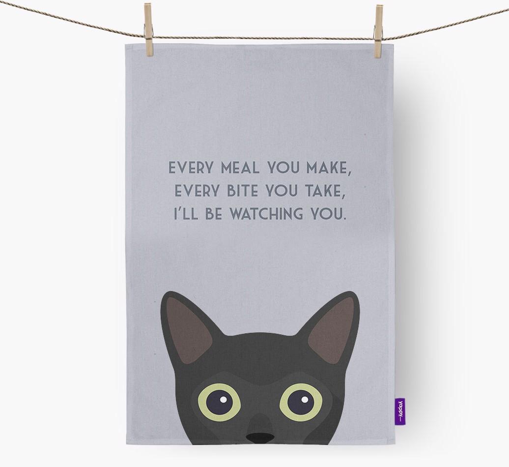 Printed with the words: ‘Every meal you make, every bite you take, I’ll be watching you’, this dish towel is purrfect for letting your cheeky Bombay know you’re onto them!