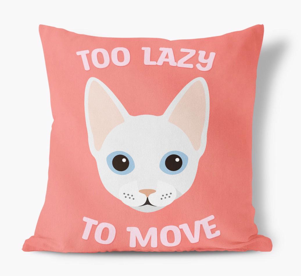 Featuring your Cornish Rex's icon, the words 'Too Lazy To Move' and available in five bold colors, this pillow will add a sprinkle of Cornish Rex's pawsonality to any living area.