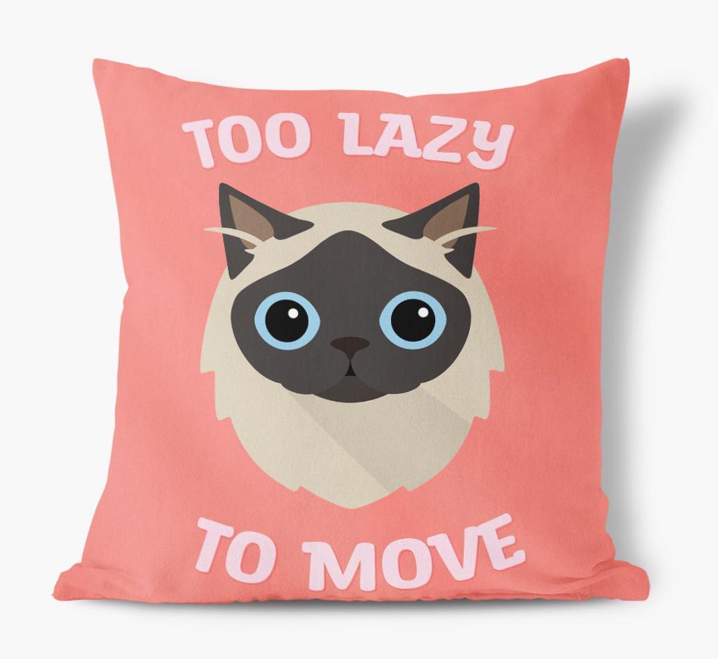 Featuring your Himalayan's icon, the words 'Too Lazy To Move' and available in five bold colors, this pillow will add a sprinkle of Himalayan's pawsonality to any living area.