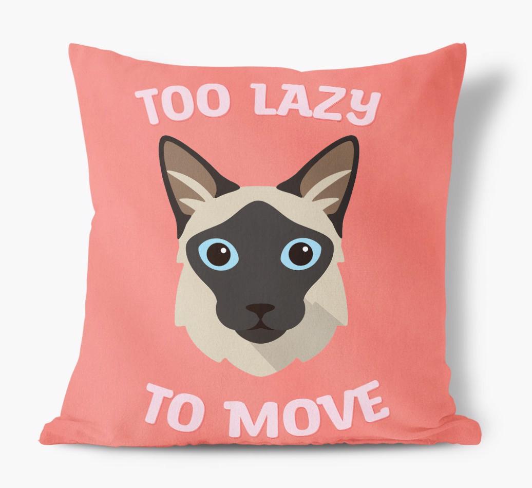 Featuring your Javanese's icon, the words 'Too Lazy To Move' and available in five bold colors, this pillow will add a sprinkle of Javanese's pawsonality to any living area.