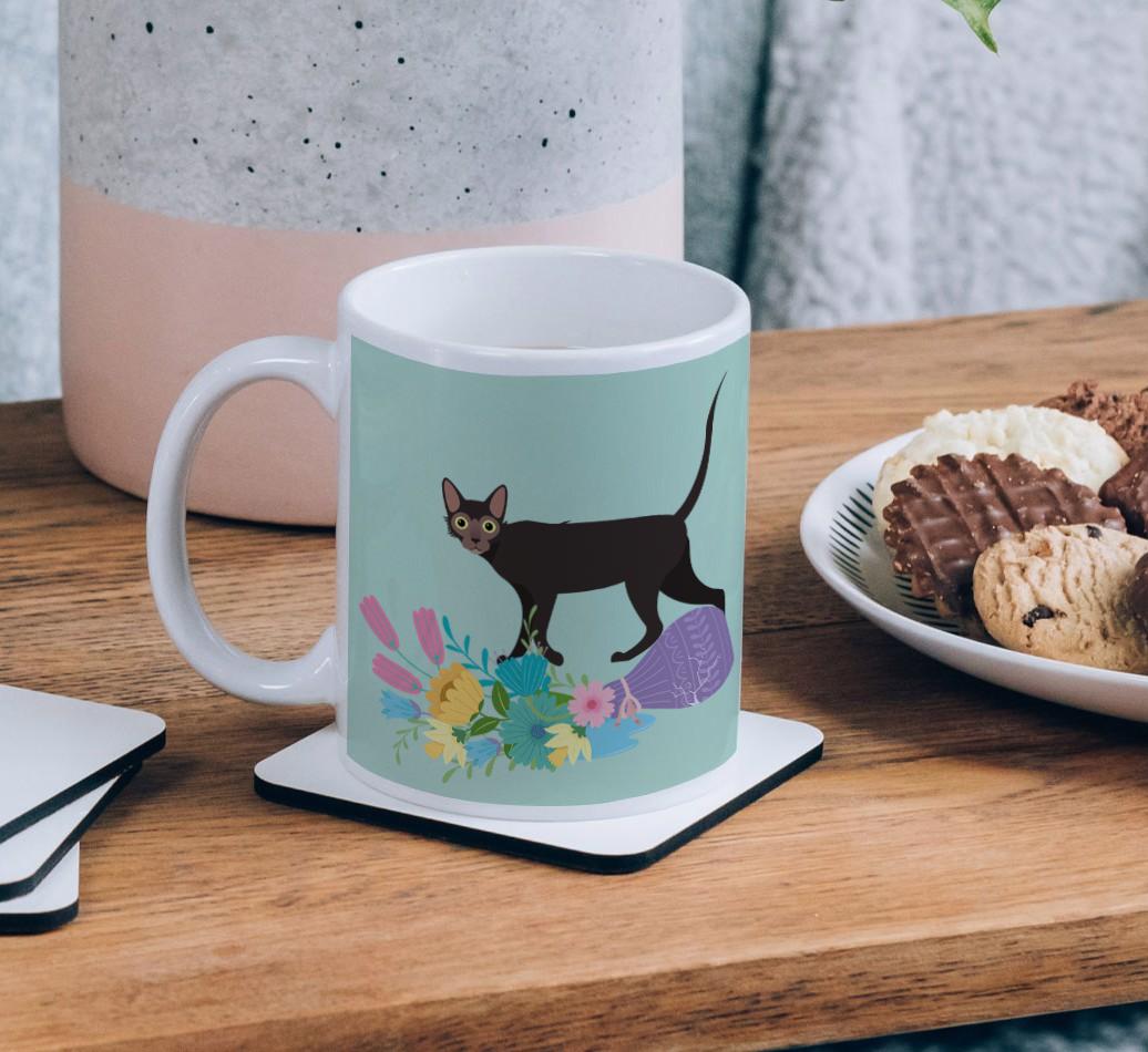 This mug comes in three pastel colors and a floral design, furrfect for keeping a watchful eye over your Lykoi!