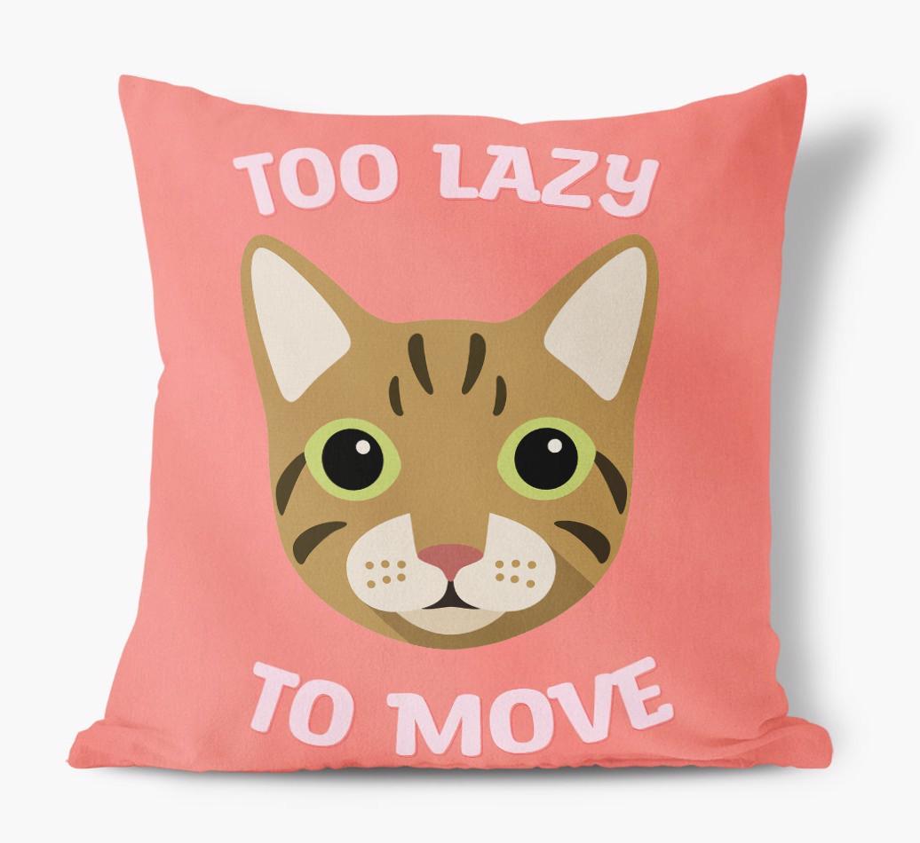 Featuring your Ocicat's icon, the words 'Too Lazy To Move' and available in five bold colors, this pillow will add a sprinkle of Ocicat's pawsonality to any living area.