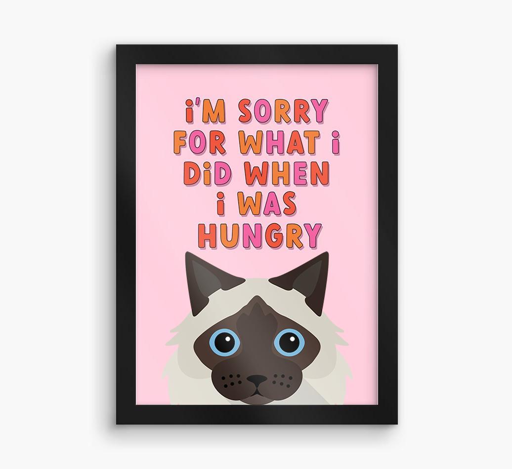 Does Cat turn into a wild animal when they're hungry? Can you relate? With this print in the home, at least you'll always be reminded of how sorry your Cat is for their actions when they were hungry. Just look at this print and your kitty's cute face and all will be fur-given... Hopefully.
