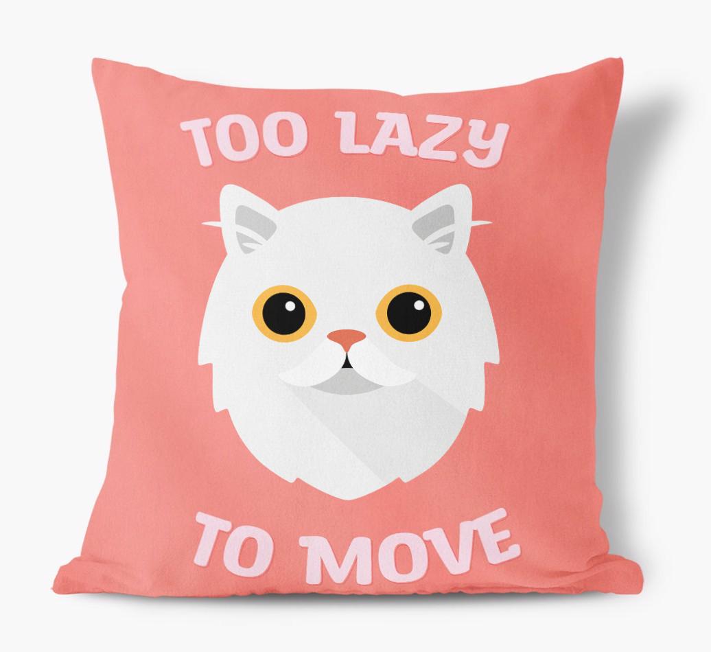 Featuring your Cat's icon, the words 'Too Lazy To Move' and available in five bold colors, this pillow will add a sprinkle of Persian Modern's pawsonality to any living area.