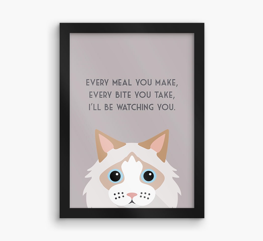 Printed with the words, ‘Every meal you make, every bite you take, I’ll be watching you’ and complete with our cute Ragamuffin peeking from the bottom of the design, this artwork will look great on display in the kitchen or anywhere Ragamuffin likes to watch you eat!