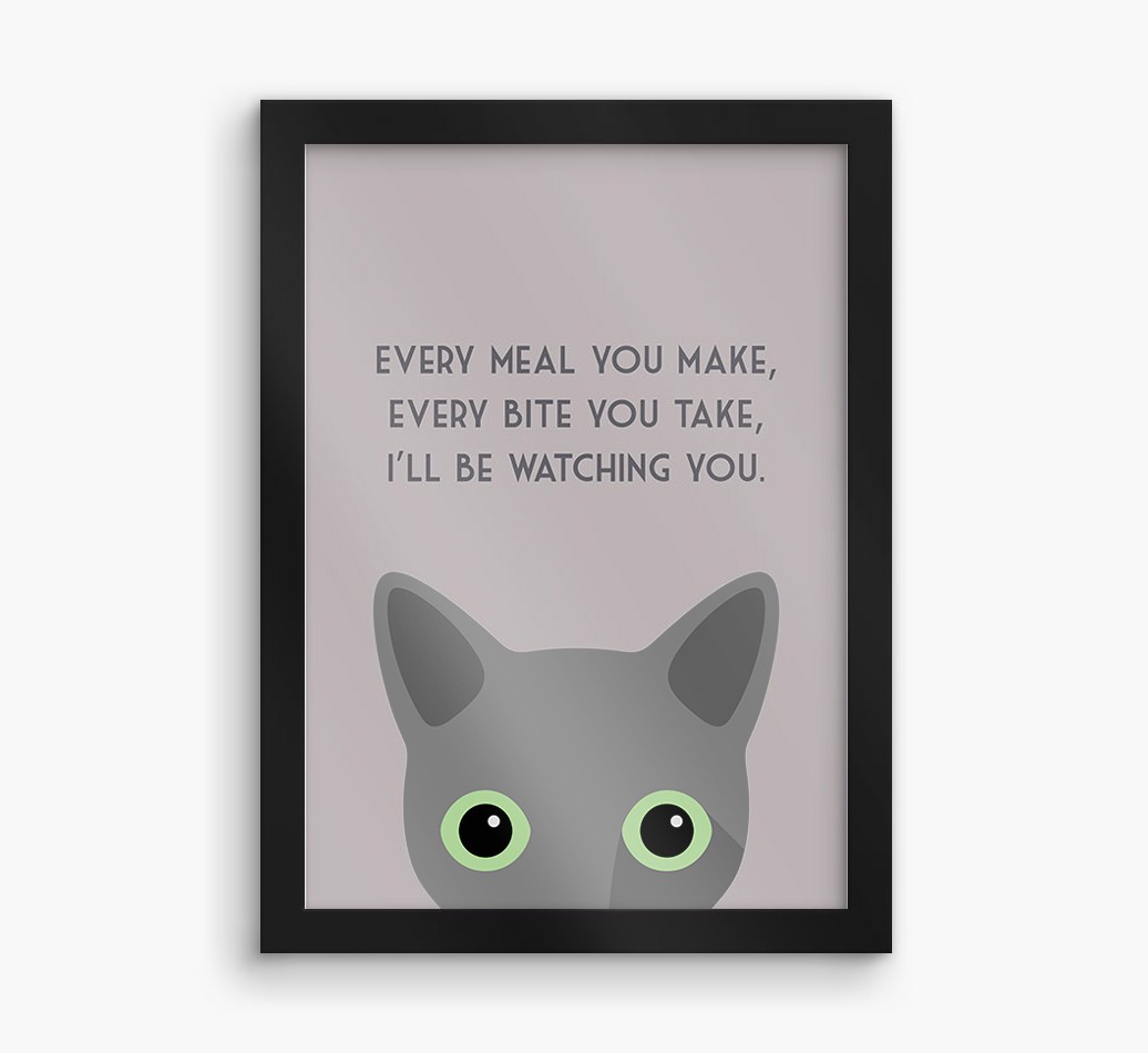 Printed with the words, ‘Every meal you make, every bite you take, I’ll be watching you’ and complete with our cute Cat peeking from the bottom of the design, this artwork will look great on display in the kitchen or anywhere Russian Blue likes to watch you eat!