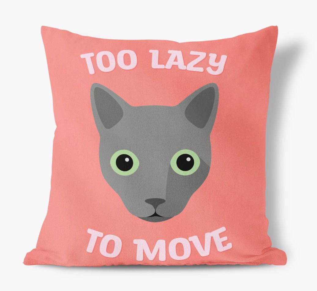 Featuring your Cat's icon, the words 'Too Lazy To Move' and available in five bold colors, this pillow will add a sprinkle of Russian Blue's pawsonality to any living area.
