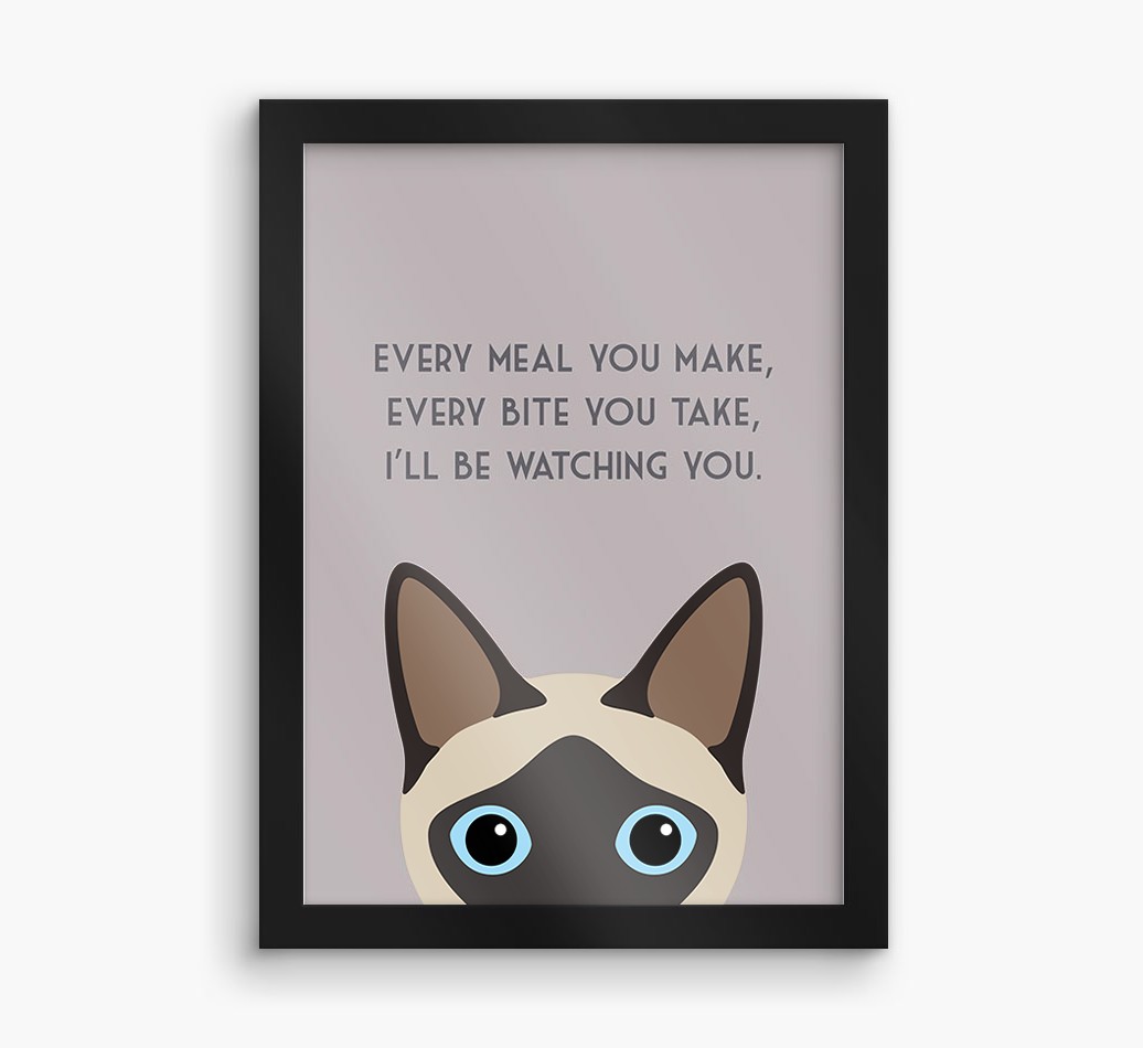 Printed with the words, ‘Every meal you make, every bite you take, I’ll be watching you’ and complete with our cute Siamese peeking from the bottom of the design, this artwork will look great on display in the kitchen or anywhere Siamese likes to watch you eat!