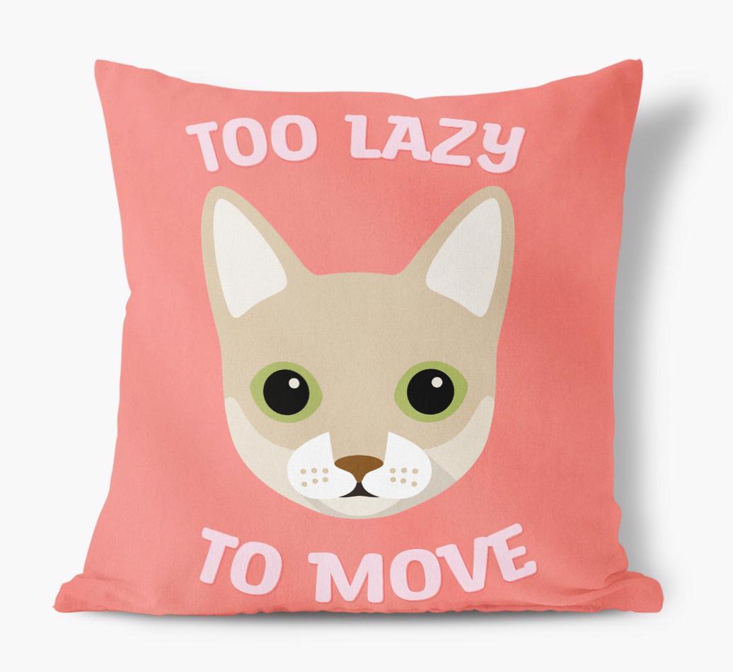 Featuring your Singapura's icon, the words 'Too Lazy To Move' and available in five bold colors, this pillow will add a sprinkle of Singapura's pawsonality to any living area.