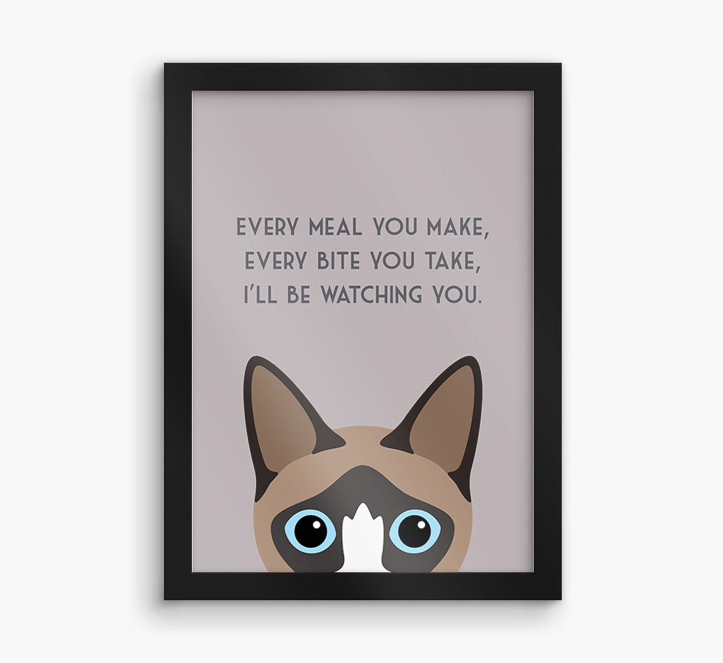 Printed with the words, ‘Every meal you make, every bite you take, I’ll be watching you’ and complete with our cute Snowshoe peeking from the bottom of the design, this artwork will look great on display in the kitchen or anywhere Snowshoe likes to watch you eat!