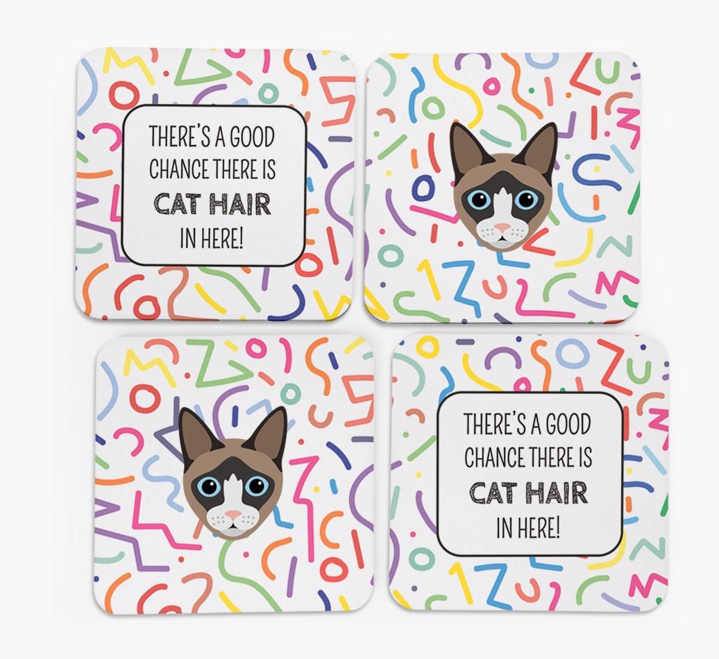 With two coasters featuring cute Snowshoe icons, the other two provide a warning to friends and family: ‘There’s a good chance there’s cat hair in here!’