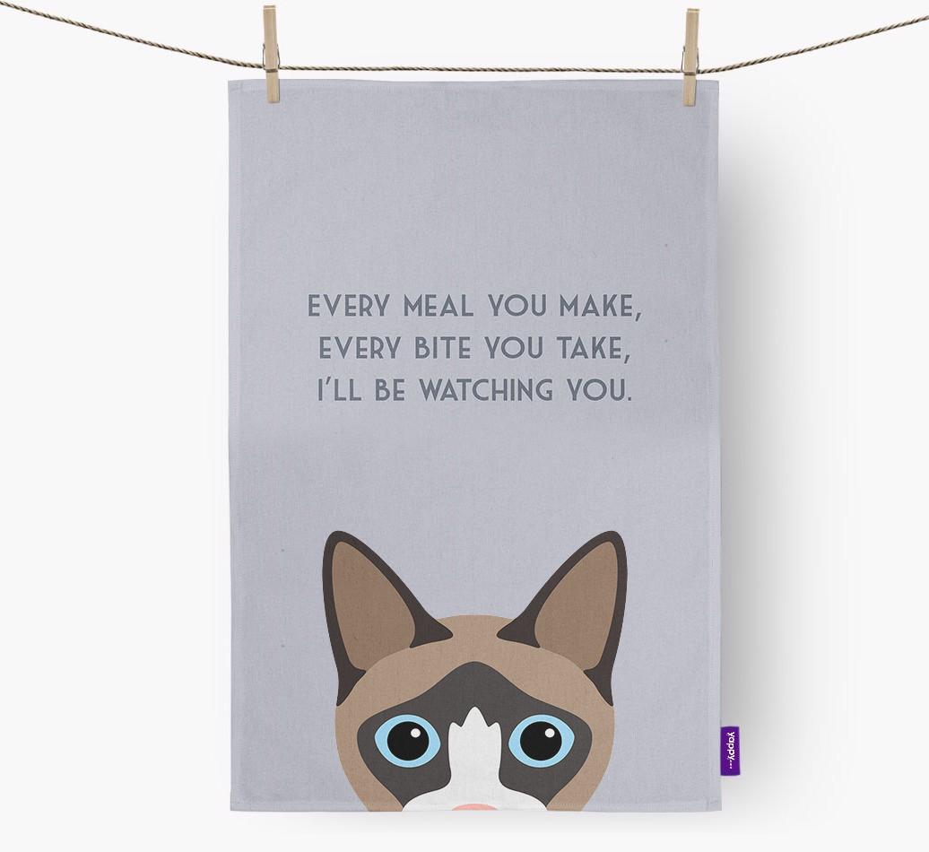 Printed with the words: ‘Every meal you make, every bite you take, I’ll be watching you’, this dish towel is purrfect for letting your cheeky Snowshoe know you’re onto them!