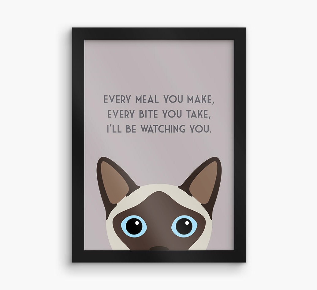 Printed with the words, ‘Every meal you make, every bite you take, I’ll be watching you’ and complete with our cute Tonkinese peeking from the bottom of the design, this artwork will look great on display in the kitchen or anywhere Tonkinese likes to watch you eat!