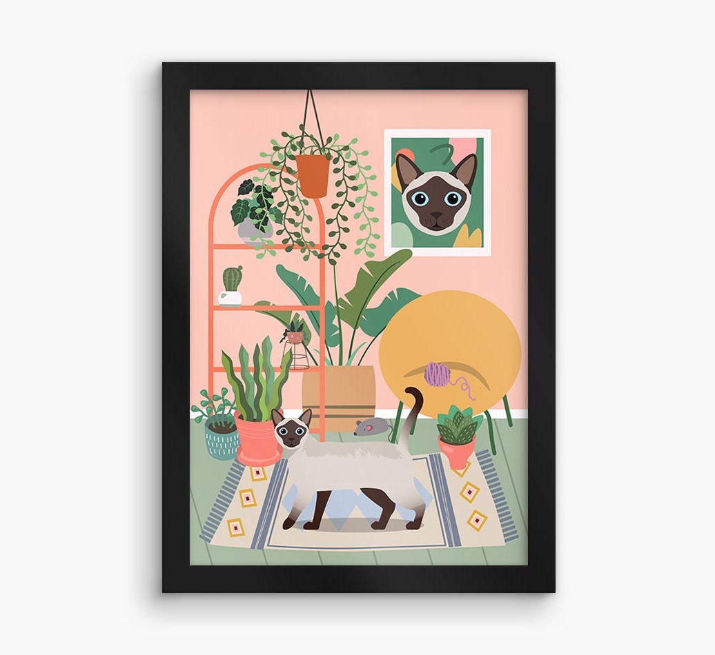 This contemporary piece of wall art pairs a chic living space with lovely pastel tones and a jungle of houseplants. Complete with the one that makes your house a home - Tonkinese! - this print is a wonderful way to display your love for your kitty.