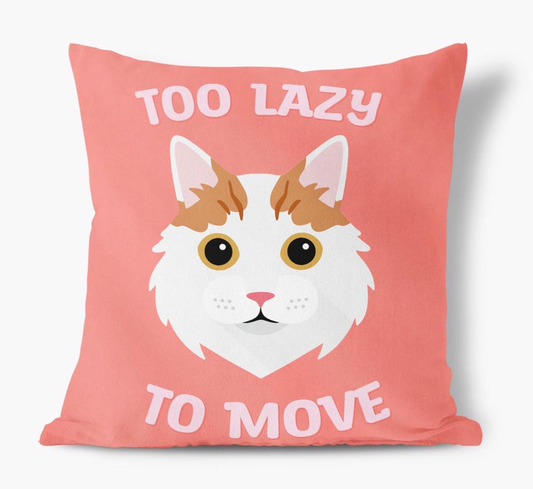 Featuring your Cat's icon, the words 'Too Lazy To Move' and available in five bold colors, this pillow will add a sprinkle of Turkish Van's pawsonality to any living area.