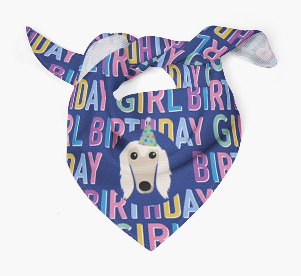 Featuring a text pattern that reads 'birthay girl' and personalized with Afghan Hound's cute icon (complete with a fun party hat), your Afghan Hound will look simply pawgeous on their special day when they're wearing this bandana.
