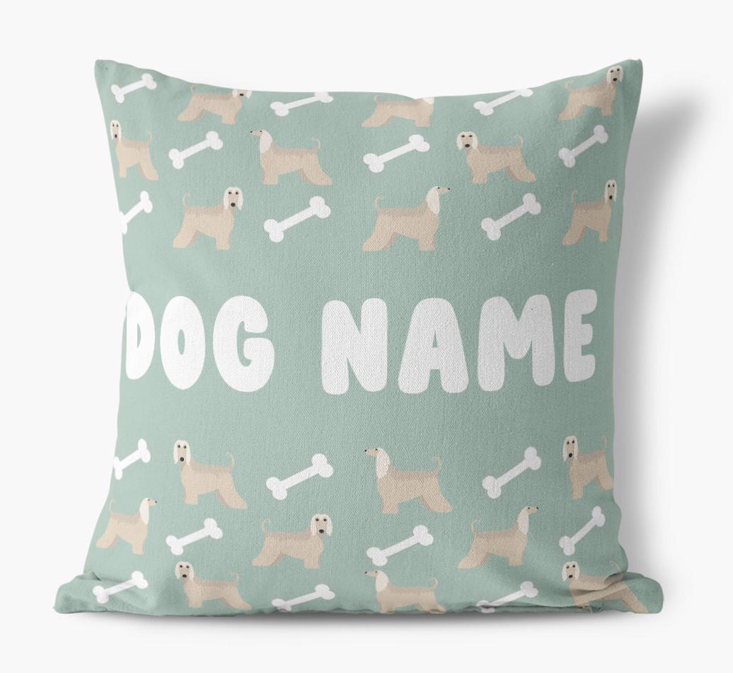 Personalized with Afghan Hound’s name against a background of Afghan Hound icons and bones, this gorgeous pillow is full of pawsonality.