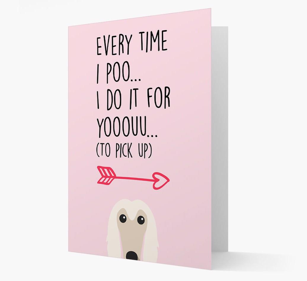 Printed with the words ‘Everytime I poo… I do it for youuuuu (to pick up)’, this lyrical card is personalized with our famous Afghan Hound icon – so it’s clear who’s been leaving you all those delightful ‘gifts’ to pick up!