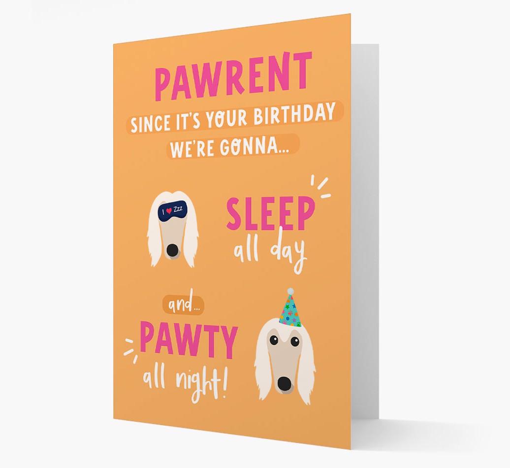 If Afghan Hound woofs to pawty all day and sleep all night, this card encourages their pawrent to do it with them on their birthday!