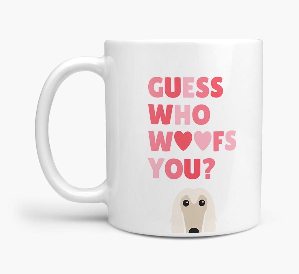 Personalized with Afghan Hound's cute face, this adorable mug is perfect for showing off the one who "woofs" you - how sweet!