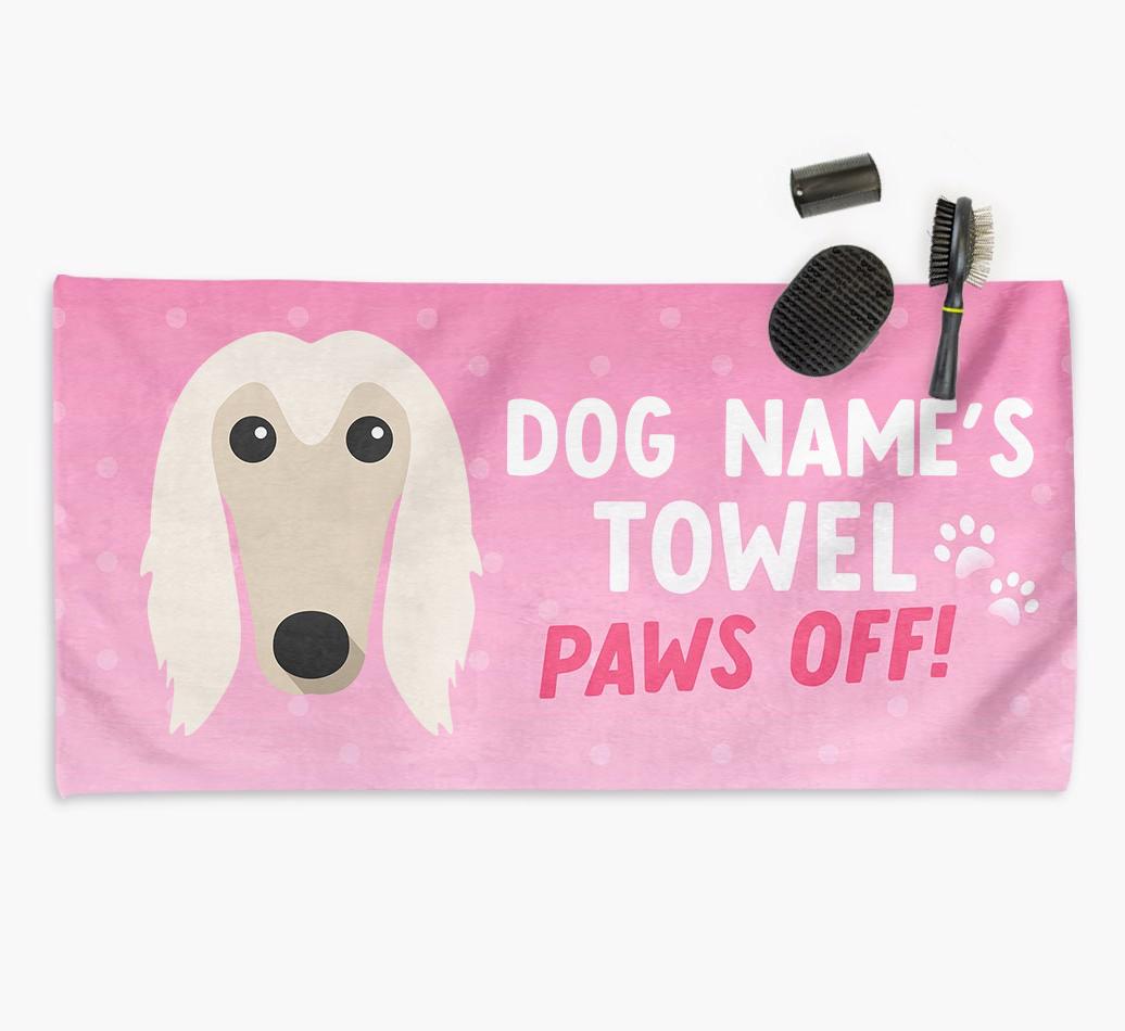 Perfect for messy pups and for pampering your Afghan Hound at bathtime, this soft and absorbent towel is made for cleaning your mucky pup and drying them off in a flash. It's personalized with Afghan Hound's name and icon and is printed with a message for everyone else to keep their paws off it!
